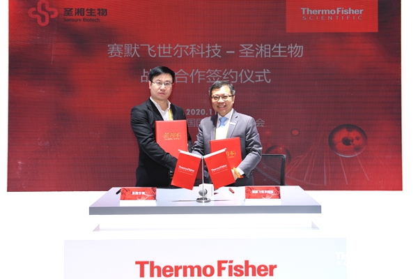 11月8日,在第三届中国国际进口博览会期间,分子诊断龙头企业圣湘生物科技股份有限公司(简称“圣湘生物”)与科学服务领域的世界领导者赛默飞世尔科技(中国)有限公司(简称“赛默飞”),签署战略合作伙伴关系备忘录,圣湘生物营销管理委员会执行总经理万东池、赛默飞基因科学与临床测序大中华区商务运营高级总监許興國等出席签约仪式,并代表双方签署合作备忘录。