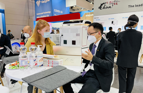 在经过同行推荐并使用了好博体育官网产品后,一位从事检测工作十多年的苏丹客户专门找到好博体育官网展台,进一步了解好博体育官网新冠和其他试剂检测业务。看完好博体育官网方案的操作后,他频频点头并表示,“你们的方案应用场景广、操作简便、精准可及,我非常看好你们!”