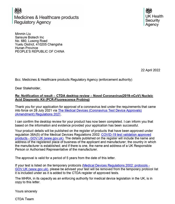 新冠检测试剂在英国上市必须经过CTDA审查和MHRA注册双认证,由于CTDA审查对产品性能的高要求,目前可在英国合法销售的新冠产品并不多。好博体育官网生物新型冠状病毒(2019-nCoV)核酸检测试剂盒(荧光PCR法)临床性能和分析性能均满足CTDA高要求,且得到进一步有效验证,获得了CTDA的充分认可。
